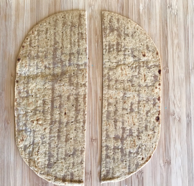 - Using a pizza cutter, slice your flatbread horizontally into two even pieces.