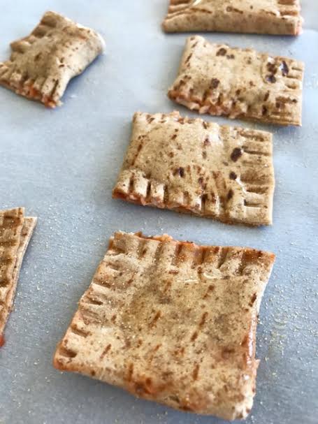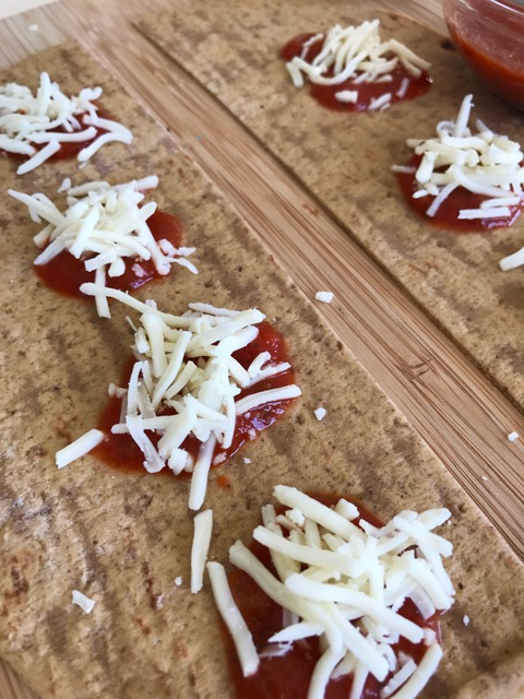 - Place small scoops of tomato sauce an inch apart over the right side of flatbread piece (you want to be able to fold each piece in half, so the sauce should not be centered). When you are placing the scoops of tomato sauce, less is more! You don’t want the sauce to leak out when you go to create the actual pizza bites.