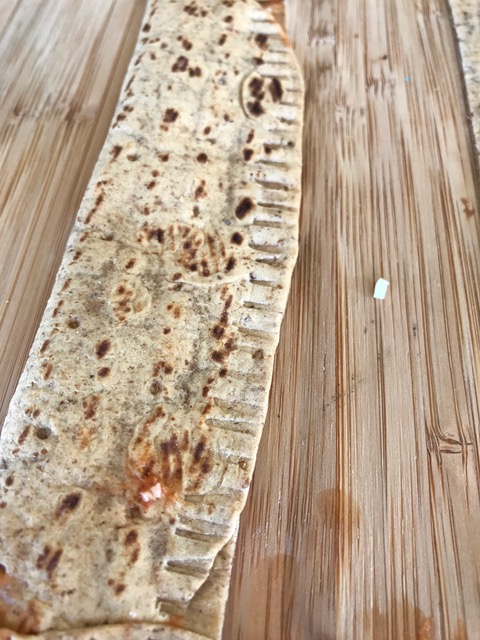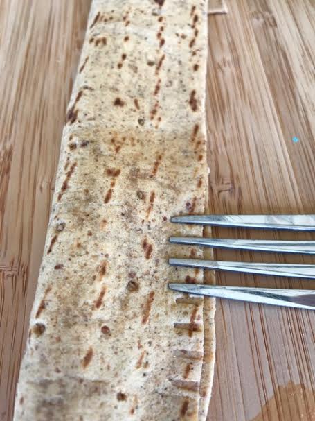 - Using a pizza cutter (or knife) slice the folded flatbread to create individual bite-sized pieces. Once cut, use the fork to seal the remaining edge closed.