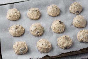 - Scoop dough by the tablespoon onto lined cookie sheets and bake for 15-18 minutes until edges are light brown.